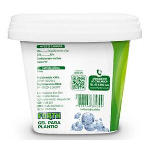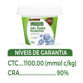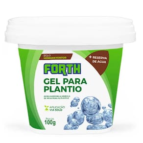 Características * Copolímero Acrílico de Potássio e Acrilamida * CTC 1100 (mmolc/kg) * CRA 90% * Natureza física: Sólido * Categoria: Condicionador de solo classe "E" * Embalagem: Pote de 100g Informações/Dicas/Usos * Atenção: Não deixar o FORTH Gel hidratado exposto ao sol e nem aplicar em superfície, a solução deve ser sempre enterrada. * Não recomendamos aplicar o FORTH Gel sem hidratar antes.