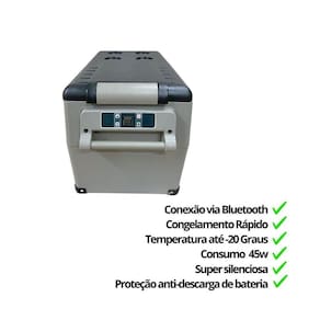Geladeira portátil 35 litros com controle via Bluetooth, quadrivolt (12v/24v, 110v/220v), modo congelamento máximo ou economia, 1 compartimento maior e outro menor, luz de LED interna, ajuste de temperatura, resfriamento até -20ºC, potência 45W.Tipo de Degelo