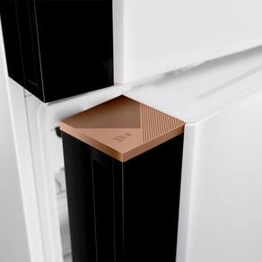 Acabamento interno (refrigerador): Prateleiras de vidro com perfis em plástico extrudado; prateleiras de porta em plástico injetado e texturizado; gavetas em plástico injetado, texturizado e tampografado; tampa da gaveta de legumes em plástico injetado
