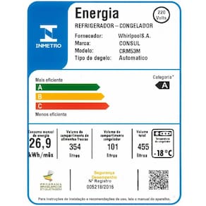 Caracteristicas: Marca: Consul Capacidade: 455L Consumo: 26,9 kW/ ano Frequencia: 60 Hz Painel de controle: Interno Voltagem: 220v Funcoes do Produto: Tecnologia Inverter