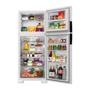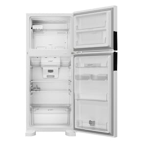O modelo inclui ainda separador de garrafas, 2 porta-ovos removiveis, compartimento Extra-Frio, alem de 2 formas de gelo com capacidade total para 18 cubos e dreno de degelo no freezer.