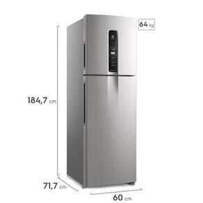 Características Adicionais - Acabamento da Porta/Frontal: Inox LookAcabamento Lateral: VCMAlarme de Porta Aberta: SimAltura (embalado) (mm): 187,9 cmAltura do produto: 184,7 cmAutoSense: SimCapacidade Bruta do Freezer (L): 126Capacidade Bruta do Refrigerador (L): 298Capacidade Bruta Total (L): 423Capacidade Líquida do Freezer (L): 117Capacidade líquida do refrigerador (L): 293Capacidade Líquida Total (L): 409Cesta Porta-Ovos: SimClassificação Energética: A+++Compartimento Congelamento Rapido: SimCompartimento Extra Frio: SimCompartimento FlexiSpace: NãoConectividade: NãoConsumo Energético (kWh/Mês): 42,4Conteúdo da Embalagem: Refrigerador, Porta Ovos, Forma de Gelo, Guia Rápido e Manual de Instruções.Controle de Temperatura: AutomáticoCor: Inox LookCor da Porta: Inox LookCor do Gabinete (Interior): BrancoDegelo Automático: SimDimensões do produto (AxLxP): 184,7 cm x 60 cm x 71,7 cmDimensões do produto embalado (AxLxP): 187,9 cm x 64,9 cm x 74,7 cmDispenser de Água na Porta: NãoDispenser de Gelo na Porta: NãoFiltro Desodorizador: Sim, TasteGuard (Vendido Separadamente)Frequência (Hz): 60Função Turbo Freezer: NãoFunção Turbo Refrigerador: NãoGarantia do Produto: 12 MesesGás Refrigerante: R600aIluminação Interna (Freezer): NãoIluminação Interna (Refrigerador): Sim (LED)Instalação : NãoLargura (embalado) (mm): 64,9 cmLargura do produto: 60 cmMaquina de Gelo Automatica: NãoMaterial /Composição: VCMMaterial das Prateleiras: Gabinete: Vidro Temperado/ Plástico Transparente Porta: Plástico TransparenteNCM: 84181000Nível de Ruído (dB): 49Painel Digital: SimPés Niveladores: SimPeso Bruto (embalado): 60 KgPeso Líquido (desembalado): 58 KgPNC: 924262913Porta Latas (prateleira de latas): NãoPorta Reversível: NãoPrateleiras Expansíveis (Fast Adapt): SimPrateleiras Removíveis: SimPrateleiras Retráteis: SimPrateleiras Reversíveis: SimProfundidade (embalado) (mm): 74,7 cmProfundidade do produto: 71,7 cmPuxadores: Sim (Embutido)Quantidade de Portas: 2Quantidade de Prateleiras e Gavetas (Freezer): Gabinete: 2 Prateleiras Porta: 2 PrateleirasQuantidade de Prateleiras e Gavetas (Refrigerador): Gabinete: 4 Prateleiras e 1 Gaveta Porta: 3 PrateleirasRodízios: SimSelo Procel: NãoSeparador de Garrafas: NãoTecnologia Inverter: SimTensão (V): 127VTipo de Compressor: InverterTipo de Degelo: Frost FreeTrava de segurança (Função Trava Painel): Sim