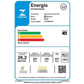Caracteristicas: Quantidade de Portas: 2 Capacidade liquida total -L-: 431 L Capacidade Bruta do Freezer -L-: 199 Capacidade liquida do freezer -L-: 164 L Capacidade bruta do refrigerador -L-: 274 L Capacidade liquida do refrigerador -L-: 267 L Alarme de Porta Aberta: Sim Cesta Porta-Ovos: Sim Controle de Temperatura: Automatico Frequencia -Hz-: 60 Gas Refrigerante: R600A Iluminacao Interna -Refrigerador-: Sim -LED- Material /Composicao: Aco Pes Niveladores: Sim Tecnologia Inverter: Sim Rodizios: Sim 4 Fixos Tipo de Degelo: Automatico Prateleiras Removiveis: Sim Material das Prateleiras: Gabinete: Vidro Temperado Porta: Plastico Transparente Inmetro: 018893/2024