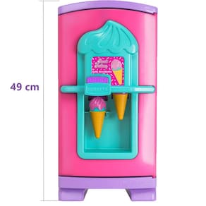Essa linda geladeira tem um tamanho grande e encorpado. Com 49 cm de altura, e diversos acessórios para brincar, ela tem um dispenser na porta, prateleiras internas, forminha para fazer sorvete de verdade, cartela de adesivos e caixinhas para recortar e montar que tornam a brincadeira ainda mais lúdica e divertida