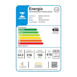 Caracteristicas: 2 Portas 4 Prateleiras do Refrigerador Acessorios Porta ovos -28 unid.-, bandeja Ice Maker Twist Capacidade total 416L -Freezer 100L / Refrigerador 316L- Consumo 34 kWh/mes Design Acabamento inox, interno branco Eficiencia energetica A+++ -PROCEL- Funcoes Turbo Freezer, Modo Compras, Bloqueio de Painel Gavetas 3 no freezer e uma para frutas Iluminacao LED interno Material externo da porta VCM -Vinyl Coated Metal- e um acabamento decorativo laminado sobre um substrato de aco zincado. Nao e aco inox Material do gabinete PCM -Pre Coated Metal- substrato de aco zincado com pintura decorativa aplicada na superficie superior Material da gaveta interna e prateleiras GPPS -Poliestireno de uso geral- + PP -Polipropileno- Numero de Registro no INMETRO 000668/2022 Painel Touch Tecnologia Frost Free, Inverter, Flexi-volt Tipo de Tomada 10A Voltagem Bivolt automatico -127V/220V-