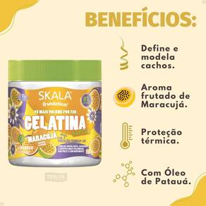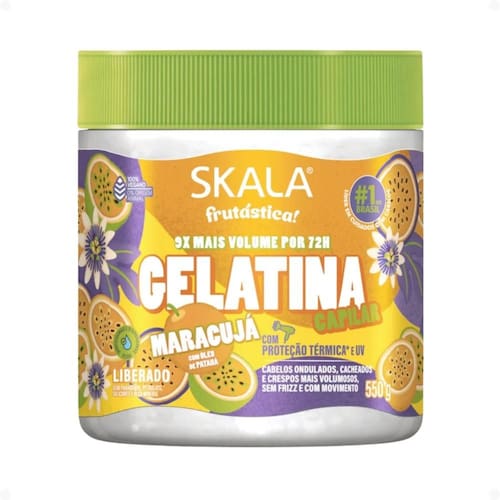 A Gelatina Capilar Skala Frutástica! Maracujá mantém o comprimento saudável dos fios, proporcionando força, resistência e um brilho intenso. Além disso, conta com proteção térmica e UV, formando uma película protetora ao redor da fibra capilar contra altas temperaturas (até 230 graus) de secadores e difusores. Seus cabelos ficarão deslumbrantes, com controle de frizz e movimento.