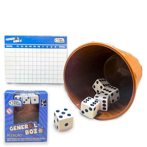 - Contém: 1 copo / 5 dados / e um bloquinho de pontos