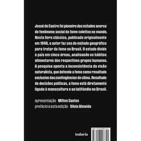 Título do livro : Geografia da fome Subtítulo do livro : O dilema brasileiro: pão ou aço Autor : Castro, Josué de Idioma : Português Editora do livro : Todavia Capa do livro : Mole Ano de publicação : 2022 Quantidade de páginas : 400 Altura : 208 mm Largura : 135 mm Peso : 485 g Gênero do livro : Direito, política e ciências sociais Subgêneros do livro : Ciências sociais Data de publicação : 16-09-2022