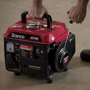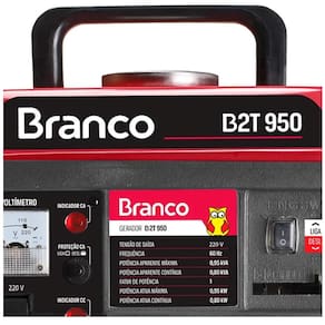Especificações Técnicas: Modelo: B2T-950 Motor: 1,9 cv - 2 Tempos Partida: Manual Potência Máxima: 0,95 kVA Potência Contínua: 0,80 kVA Tensão de Saída Principal: 220V Carregador de Bateria: 12 V; 8,3 A Capacidade do Tanque: 4,5 l Autonomia (50% de carga): 8 h Fases: Monofásico Bitola do Fio Recomendado (mm): 2,5 mm Ruído: 56 dBA