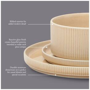 Imagine uma pitoresca cidade costeira, com seu estilo de vida descontraído e sol radiante, sendo a fonte perfeita de inspiração para contar histórias, criar designs ou inovar. A Coleção de Jantar Reativo Solana Coast da Gibson Elite captura o charme imaculado de uma cidade à beira-mar e o traduz em um elegante conjunto de jantar, ideal para refeições internas e externas. O acabamento de alto brilho reflete o sol sobre as águas calmas, adicionando um brilho incrível a cada peça. Produzida a partir de argilas terrosas, esta coleção se transforma em uma impressionante estoneware que complementa qualquer ambiente e realça a vivacidade de cada prato. Sua confecção requer um processo intricado, no qual as peças são queimadas várias vezes em altas temperaturas para criar uma construção resistente ao desgaste e não porosa. Uma camada de esmalte reativo finaliza o processo, permitindo que cada prato e tigela ganhem vida com sutis variações naturais, garantindo que nenhuma peça seja igual à outra. Projetada com lados altos e retos para empilhamento fácil e nervuras exteriores para adicionar profundidade e textura, esta coleção alcança o equilíbrio perfeito entre a elegância clássica e o estilo contemporâneo. Como um conjunto de utensílios domésticos impressionantes, este jogo de jantar é um presente de bom gosto para qualquer ocasião. Amado tanto por sua utilidade prática quanto por seu apelo decorativo, ele expressa seu gosto impecável e votos de felicidade para familiares, amigos, novos proprietários e recém-casados. Adequado para lava-louças e micro-ondas, o Gibson Elite oferece uma mistura elegante de forma e função em uma infinidade de utensílios de mesa e acessórios de servir, possibilitando inúmeras possibilidades para mesas criativas e ocasiões especiais.