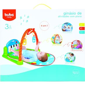 O Ginásio de Atividades Piano Buba é ideal na hora de divertir e estimular o aprendizado dos bebês. Acompanha diversas fases do bebê e contribui para o crescimento saudável da criança, através de cores e formas, texturas e sons com tema de animais. 1- Piano Removível: Pode ser Preso no berço ou levado em passeios, O Bebê pode brincar deitado no berço apertando as teclas, Possui música de Ninar que ajuda o bebê a dormir mais rápido, acionando modo noturno, com volume baixo recomendado para o sono. 2-Brincar deitado: Tapete confortável e acolchoado com arco de bichinhos de atividades pendurados para o bebê se divertir nesta fase em que fica deitado, Possui espelho para o bebê se reconhecer, - Com o piano acoplado, o bebê pode tocar com os pés. 3-Brincar de Bruços: - Os brinquedos de atividades podem ser presos no tapete para o bebê brincar de bruços, 4- Brincar Sentado: - Na fase em que o bebê ficar sentado, pode se entreter tocando o piano, que possui 4 teclas com músicas e luz em 3 modos musicais.