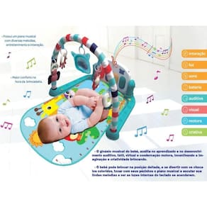 Formas de brincar: Deitado sobre o tapete acolchoado e interagindo com os brinquedinhos, o bebê poderá apertar os teclados com os pés, que acenderão e tocarão diversos sons ou lindas músicas ajustáveis. Quando o bebê conseguir se sentar, poderá ajustar o teclado na posição horizontal, virando uma mesa musical para brincar com as mãos! O tapete é macio e protege o pequenino da superfície fria.