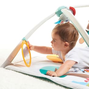 O espelho estimula o bebê a passar mais tempo de bruços do bebê, o que fortalece os músculos. O Tapete Gymini Into the Forest ainda incentiva o desenvolvimento dos sentidos, da cognição, da linguagem, imaginação e inteligência emocional. Brinquedos eletrônicos removíveis com músicas e luzes. Chocalho, mordedor e treme-treme. Ajuste os arcos para mais modos de brincar!