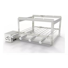 - estrutura 100% em aço inox 430. -posição do motor: lado esquerdo ou direito - espetos tridente inox com cabos de madeira revestidos em alumínio não esquentam . Possuem formato ergonômico que proporcionam maior firmeza no manuseio. - descanso de espeto ou grelha na parte superior para afastar o assado da brasa. - os espetos giram em sentidos opostos, evitando que enrosquem um no outro. - motor silencioso. - design moderno.