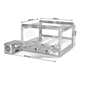 Especificações técnicas: modelo: 4 espetos material da estrutura: aço inox 430; motor: bivolt com chave seletora de voltagem 127v/220v ; posição do motor: esquerdo/direito escolher o lado no momento da compra . Peso por espeto: 2 kg serve até 25 pessoas dimensões: largura:51cm sem motor largura: 61cm com motor altura: 32 cm profundidade: 45cm comprimento do espeto: 65 cm 15 cm do cabo até a roldana, e 50cm da roldana até a ponta. Peso:6kg conteúdo da embalagem: - estrutura completa da churrasqueira giratória com motor. - 04 espetos tridente. - 01 manual de instruções. -kit parafusos