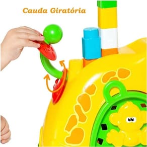 É um centro de atividades musicais com 15 blocos para molto pré-escolar, pescoço articulado, espaço interno para guardar os blocos, espaço no pescoço e lombo para encaixar os blocos e completar sua girafa.