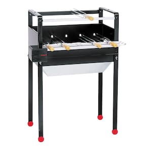 A Churrasqueira Giragrill Garden 2100, conta com 5 espetos giratórios em aço cromado com cabos de madeira marfim acionados por motor elétrico bivolt, acabamento em aço com pintura eletrostática, peças cromandas e calha em inox e pés desmontáveis para transporte.