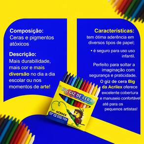 Kit com 3 caixas de Giz de Cera Big Acrilex, ideal para atividades escolares e recreativas. Cada caixa contém 12 cores vibrantes, com textura macia e excelente cobertura. O formato Big facilita o manuseio pelas crianças, oferecendo mais conforto e resistência durante o uso. Produto de alta qualidade, indicado para estimular a criatividade e a coordenação motora. Dimensões da caixa: 14 x 14 x 4,5 cm. Ideal para escolas, professores, pais e uso doméstico.
