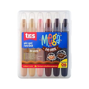 O MEGA Gel que você já conhece agora em tons de pele É um giz de traço super macio e com corpo plástico ergonômico que facilita a pegada. É retrátil, então não suja nem o estojo nem à mão E é resistente à quebra. Tudo isso o torna um ótimo produto para a pré-escola.