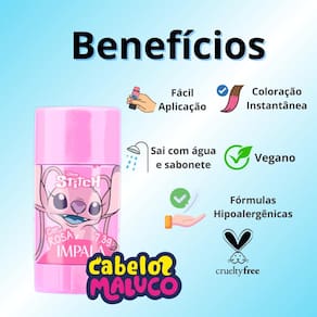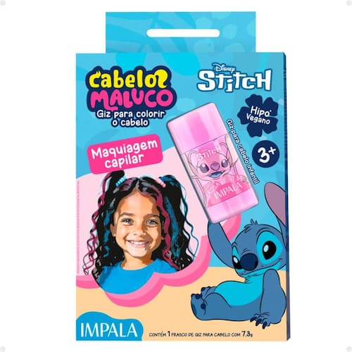 O Giz de Cabelo Stitch da Impala é a forma mais rápida, divertida e segura de transformar o visual infantil em segundos! Com aplicação simples e efeito imediato, ele colore os fios com um toque de criatividade ideal para o Dia do Cabelo Maluco, festas à fantasia, eventos escolares ou brincadeiras em casa.