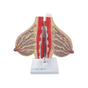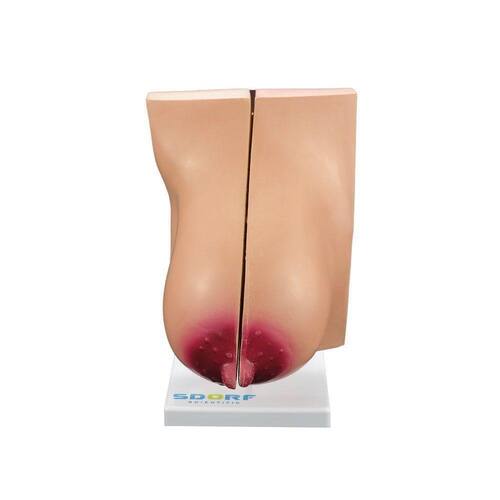 Modelo anatômico de glândula mamária em lactação em tamanho natural, confeccionado em PVC com pintura feita à mão e cores realísticas; Este modelo anatômico possui corte sagital na linha mamária e divide-se em duas partes; Com o modelo anatômico de glândula mamária em lactação em tamanho natural SD-5092 é possível identificar dentre outras estruturas: * Auréola da mama; * Costelas; * Dilatação do ducto lactífero; * Fáscia profunda; * Gordura na fáscia superficial; * Ligamento superior mamário; * Lóbulo contendo alvéolos; * Músculo peitoral maior; * Músculos intercostais; * Papila mamária (mamilo).