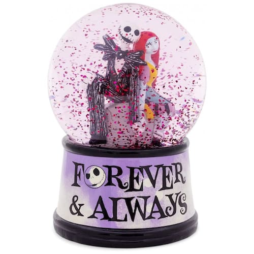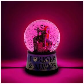 Reviva a eterna história de amor de Jack e Sally com este globo de neve iluminado da coleção oficial Disney inspirado no clássico de Tim Burton, O Estranho Mundo de Jack. Esta peça colecionável mede cerca de 15 cm de altura e apresenta uma cena detalhada dos personagens no cemitério, sobre uma base decorada com a frase "Forever & Always". Com um simples toque no interruptor localizado na base, o globo acende uma luz suave que destaca a magia da cena enquanto o glitter cintilante gira encantadoramente. Alimentado por duas baterias LR44 incluídas, este globo combina design vintage com funcionalidade moderna, tornando-se a peça perfeita para decorar e emocionar fãs do filme durante o ano todo. Produto oficial, feito em cerâmica, ideal para colecionadores e como presente especial.