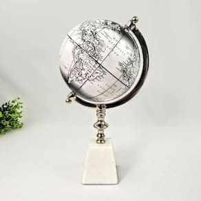 Este globo combina a beleza do design com materiais nobres. Sua base é feita de pedra natural, garantindo estabilidade e um charme orgânico e único. O suporte em metal resistente eleva o globo, que apresenta detalhes geográficos em uma moderna paleta de branco e preto. Com 33,5cm de altura, ele é o tamanho ideal para se destacar em mesas, estantes ou aparadores, complementando desde ambientes clássicos a modernos e minimalistas.