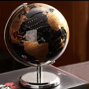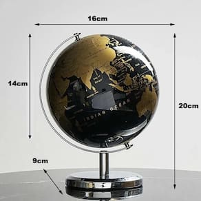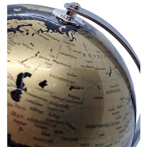 Material: Plástico e aço Inoxidável Cor do Globo: Preto e Dourado Cor da Base: Prata Medidas aprox.: 20cm x 16cm Idioma: Inglês Função: Decoração e fonte de consulta geográfica