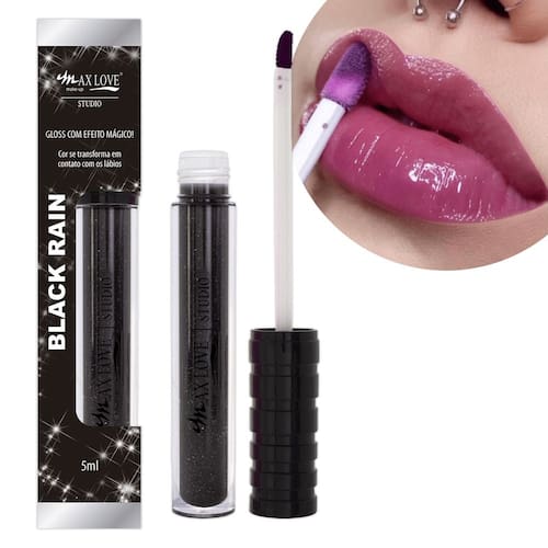 Gloss Black Rain possui efeito mágico. No frasco parece de uma cor, mas ao aplicar nos lábios sua cor muda revelando uma tonalidade diferente, variando entre mais clara ou mais escura dependendo do PH da pele que foi aplicado. Fórmula hidratante para uso diário e livre de componentes de origem animal.