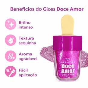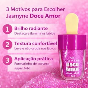 Benefícios PrincipaisO Gloss Labial Jasmyne Doce Amor é versátil e perfeito para diversas ocasiões. Use-o no dia a dia para um visual natural e radiante, em eventos especiais para um toque de glamour, ou sempre que desejar realçar seus lábios com brilho e cor. É o item essencial para complementar qualquer maquiagem, desde a mais básica até a mais elaborada.