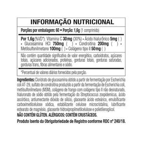 Glucosamina HCI - 750 mg Condroitina - 200 mg Metilsulfonilmetano MSM - 100 mg Colágeno Tipo II - 50 mg Ácido Hialurônico - 5 mg Vitamina C - 30 mg Recomendação de consumo: Sugere-se 1 comprimido ao dia durante a principal refeição.