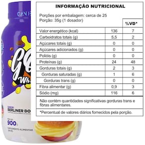 berliner donut: Proteína concentrada do soro do leite, Proteína Isolada do Soro do Leite (WPI), Proteína hidrolisada do soro do leite, Aromatizantes idênticos aos naturais, espessante goma xantana e goma guar, antiumectante dióxido de silício, edulcorantes artificiais sucralose e acesulfame de potássio.