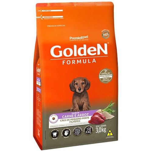 Ração Golden Cães Filhotes Raça Pequena Carne e Arroz - 3kg- Saúde oral: auxilia a redução da formação do tártaro; - Crescimento saudável: feito com DHA e proteína de qualidade elevada; - Intestino saudável: combinação de nutrientes de alta digestibilidade e fibras naturais; - Redução do odor das fezes: seleção de ingredientes especiais que auxiliam na redução do odor das fezes.