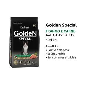 Golden Special Ração Gatos Castrados 10,1kg Frango Carne Ração Golden Special Gatos Castrados Sabor Frango e Carne 10,1kg A Ração Golden Special Gatos Castrados é desenvolvida especialmente para atender as necessidades nutricionais de gatos adultos castrados. Sua fórmula completa e balanceada oferece o equilíbrio ideal entre sabor e saúde, garantindo uma alimentação de qualidade premium para o seu pet. Com proteínas de alta qualidade, como frango e carne, esse alimento auxilia na manutenção da massa muscular, promove energia e contribui para a saúde geral do gato. Além disso, contém ingredientes selecionados que ajudam no controle do peso, fundamental para gatos castrados, que tendem a ter metabolismo mais lento.