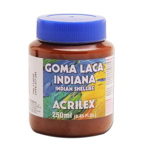 Goma Laca Indiana 250Ml Acrilex Para impermeabilizar materiais porosos e absorventes, como papel, madeira, cerâmica e gesso; para posterior pintura. Pode ser utilizada como verniz de acabamento em peças decorativas e para fixação de purpurinas e glitters. Serve também como proteção para pinturas com baixa resistência à abrasão. Solúvel em álcool. Apresenta acabamento amarelado. Código: 7891153015422. Imagens Ilustrativas. Volume: 250Ml Ean: 7891153015422
