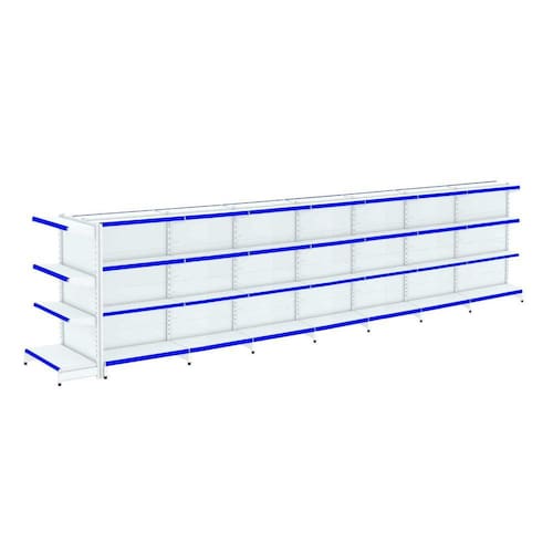 A Gôndola FIT 40 FARMA Centro é ideal para farmácia, supermercados, mercearias, lojas de utilidades, materiais de construção, agropecuárias e outros. Devido sua altura permite uma visão ampla central do comércio.