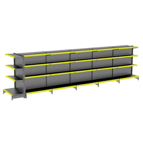 KIT GÔNDOLA CENTRO 137 FIT AMAPÁ 40/30 PRETO PARA VÃO DE ATÉ 5,30 METROS COM UMA PONTA 44 BANDEJAS PORTA ETIQUETA AMARELO