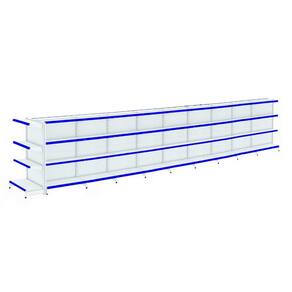 KIT GÔNDOLA CENTRO 137 FIT AMAPÁ 40/30 BRANCO PARA VÃO DE ATÉ 9,10 METROS COM UMA PONTA 76 BANDEJAS PORTA ETIQUETA AZUL