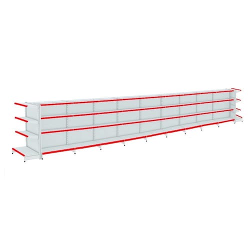 KIT GÔNDOLA CENTRO 137 FIT AMAPÁ 40/30 BRANCO PARA VÃO DE ATÉ 9,50 METROS COM DUAS PONTAS 80 BANDEJAS PORTA ETIQUETA VERMELHO