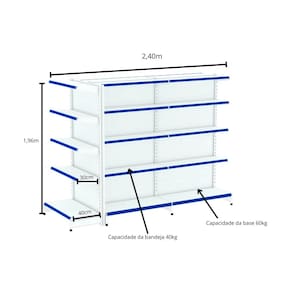 Gôndola FIT Centro Branca 1,70m Altura x 2,40m Comprimento 1 Ponta 1 Inicial 1 ContinuaçãoAs Gôndola FIT 40 amapá são ideais para armazenagem e exposição de seus produtos em supermercados, mercearias, farmácias, lojas de utilidades, materiais de construção, agropecuárias e muito mais. Equipamento para comerciantes de pequeno e médio porte que desejem aproveitar todo o espaço da loja. Facilmente instalada na parede devido ao sistema de montagem por encaixe, sem uso de parafusos. Utilizada em mercados, mercearias, farmácias, papelarias, supermercados, petshops, home centers, agropecuárias, lojas de construção, lojas de utilidades e outros negócios.Inclinação da Bandeja em 3 posições e fundo quadrado para melhor exposição. Possui bandejas reguláveis na coluna a cada 25mm, o que permite adição de bandejas extras. Sistema de reforço que permite maior capacidade de carga. Ponteira de coluna para mais proteção e durabilidade. Possui travador de parede, item obrigatório para uma instalação com segurança. O número de bandejas varia de acordo com altura; Todos os produtos Amapá possuem qualidade, resistência e durabilidade garantidas pelo uso de matérias-primas de alto padrão, processos produtivos tecnológicos e controle de qualidade. A pintura dos produtos é feita por meio da técnica eletrostática e com tratamento anticorrosão, deixando uniforme e resistente. Dimensões Aproximadas Altura: 1,70mProfundidade Bandejas Superiores: 0,30cmProfundidade Bandejas Superiores Total: 0,60cmProfundidade Bandeja Base: 0,40cmProfundidade Bandeja Base Total: 0,80cmComprimento Total: 2,40m " Medida Aproximada "Características Cor: BRANCAComprimento da Bandeja: 0,90cmQuantidade de Bandejas Por Gônodola Ponta: 5Quantidade de Bandejas Por Gôndola Inicial / Continuação: 10Quantidade de Bandejas Total: 25Capacidade das Bandejas Superiores: 40kgCapacidade das Bandejas Inferiores: 60kgPorta Etiquetas Corés Diponíveis: Azul, Vermelha, Verde e Amarelo Contém 01 Gôndola FIT 1,70m Branca Centro Inicial 80/60 – Amapá 01 Gôndola FIT 1,70m Branca Centro Continuação 80/60 – Amapá.01 Gôndola FIT 1,70m PONTA Branca 40/30 - Amapá25 Porta Etiquetas Com Acrilico - Amapá Entrega Via: TransportadoraPrazo: Consulte pelo CEP com nossos vendedoresGarantia Contra Defeitos de Fabricação: 12 meses. Dúvidas, Informações, Consulte Nossos Vendedores Via WhatsApp.\nFicha Técnica\nCódigo 623\nModelo Linha Gôndolas FIT 40 Amapá\nCategoria GÔNDOLAS AMAPÁ\nMarca Amapá Metalúrgica\nItens Inclusos 01 Gôndola FIT 1,70m Branca Centro Inicial 80/60 Amapá01 Gôndola FIT 1,70m Branca Centro Continuação 80/60 Amapá.01 Gôndola FIT 1,70m PONTA Branca 40/30 - Amapá25 Porta Etiquetas Com Acrilico - Amapá\nGarantia 1 ano após o recebimento do produto\nDisponibilidade Disponível em 2 dias úteis\nInformação adicional Dúvidas, Informações, Consulte Nossos Vendedores Via WhatsApp.