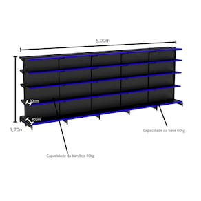 Gôndola FIT Centro 1,70m Altura x 5,00m Comprimento 1 Inicial 4 ContinuaçãoAs Gôndola FIT 40 amapá são ideais para armazenagem e exposição de seus produtos em supermercados, mercearias, farmácias, lojas de utilidades, materiais de construção, agropecuárias e muito mais. Equipamento para comerciantes de pequeno e médio porte que desejem aproveitar todo o espaço da loja. Facilmente instalada na parede devido ao sistema de montagem por encaixe, sem uso de parafusos. Utilizada em mercados, mercearias, farmácias, papelarias, supermercados, petshops, home centers, agropecuárias, lojas de construção, lojas de utilidades e outros negócios.Inclinação da Bandeja em 3 posições e fundo quadrado para melhor exposição. Possui bandejas reguláveis na coluna a cada 25mm, o que permite adição de bandejas extras. Sistema de reforço que permite maior capacidade de carga. Ponteira de coluna para mais proteção e durabilidade. Possui travador de parede, item obrigatório para uma instalação com segurança. O número de bandejas varia de acordo com altura; Todos os produtos Amapá possuem qualidade, resistência e durabilidade garantidas pelo uso de matérias-primas de alto padrão, processos produtivos tecnológicos e controle de qualidade. A pintura dos produtos é feita por meio da técnica eletrostática e com tratamento anticorrosão, deixando uniforme e resistente. Dimensões Aproximadas Altura: 1,70mComprimento Total: 5,00m " Medida Aproximada "Profundidade das Bandeja da Base: 0,40cmProfundidade das Bandeja da Base Total: 0,80cmProfundidade das Bandejas Superiores: 0,30cmProfundidade das Bandejas Superiores Total: 0,60cmCaracterísticas Cor: PRETAComprimento da Bandeja: 0,90cmQuantidade de Bandejas por Gôndola: 10Quantidade de Bandejas Total: 50Capacidade das Bandejas Superiores: 40kgCapacidade das Bandejas Inferiores: 60kgPorta Etiquetas Corés Diponíveis: Azul, Vermelha, Verde e Amarelo Contém 01 Gôndola FIT 1,70m Preta Centro Inicial 80/60 – Amapá 04 Gôndola FIT 1,70m Preta Centro Continuação 80/60 – Amapá.50 Porta Etiquetas Com Acrilico - Amapá Entrega Via: TransportadoraPrazo: Consulte pelo CEP com nossos vendedoresGarantia Contra Defeitos de Fabricação: 12 meses. Dúvidas, Informações, Consulte Nossos Vendedores Via WhatsApp.\nFicha Técnica\nCódigo 425\nModelo Linha Gôndolas FIT 40 Amapá\nCategoria GÔNDOLAS AMAPÁ\nMarca Amapá Metalúrgica\nItens Inclusos 01 Gôndola FIT 1,70m Preta Centro Inicial 80/60 Amapá04 Gôndola FIT 1,70m Preta Centro Continuação 80/60 Amapá.50 Porta Etiquetas Com Acrilico - Amapá\nGarantia 1 ano após o recebimento do produto\nDisponibilidade Disponível em 30 dias úteis