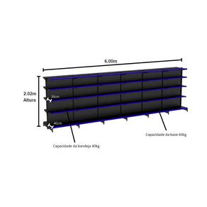 Gôndola FIT Centro Preta 2,02m Altura x 6,00m Comprimento 1 Inicial 5 ContinuaçõesAs Gôndola FIT 40 amapá são ideais para armazenagem e exposição de seus produtos em supermercados, mercearias, farmácias, lojas de utilidades, materiais de construção, agropecuárias e muito mais. Inclinação da bandeja em 3 posições e fundo quadrado para melhor exposição. Possui bandejas reguláveis na coluna a cada 25mm, o que permite adição de bandejas extras. Sistema de reforço que permite maior capacidade de carga. Ponteira de coluna para mais proteção e durabilidade. Possui travador de parede, item obrigatório para uma instalação com segurança. O número de bandejas varia de acordo com altura; Todos os produtos Amapá possuem qualidade, resistência e durabilidade garantidas pelo uso de matérias-primas de alto padrão, processos produtivos tecnológicos e controle de qualidade. A pintura dos produtos é feita por meio da técnica eletrostática e com tratamento anticorrosão, deixando uniforme e resistente. Dimensões Aproximadas Altura: 2,02mComprimento Total: 6,00m " Medidas Aproximadas "Profundidade da Bandeja da Base: 0,40mProfundidade das Bandejas Superiores: 0,30m Características Cor: PRETAComprimento da Bandeja: 0,90mQuantidade de Bandejas por Gôndola: 10Capacidade das Bandejas Superiores: 40 kgCapacidade das Bandejas Inferiores: 40 kgPorta Etiquetas Cores Disponíveis: Azul, Vermelha, Laranja, Verde ou Amarela. Contém 01 Gôndola FIT 2,02m Preta Centro Inicial 80/60 – Amapá 05 Gôndolas FIT 2,02 Preta Centro Continuação 80/60 – Amapá60 Porta Etiquetas Com Acrilico - Amapá Entrega Via: TransportadoraPrazo: Consulte pelo CEP com nossos vendedores. Garantia Contra Defeitos de Fabricação: 12 mesesDevolução Em até 7 dias após a chegada do produto, você tem o direito de realizar a devolução. Mas para isso, a mercadoria não deve ter sido montada, utilizada e danificada.Horário de AtendimentoSegunda a Sexta-feira, das 13:00h às 17:00h.Dúvidas, Informações, consulte nossos Vendedores via WhatsApp.\nFicha Técnica\nCódigo 1361\nModelo Linha Gôndolas FIT 40 Amapá\nCategoria GÔNDOLAS AMAPÁ