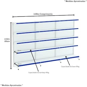 Kit Gôndola FIT Parede Branca 2,02m Altura x 3,00m Comprimento - Amapá As Gôndolas FIT 40 Amapá são ideais para armazenagem e exposição de seus produtos em supermercados, mercearias, farmácias, lojas de utilidades, materiais de construção, agropecuárias e muito mais. Equipamento para comerciantes de pequeno e médio porte que desejem aproveitar todo o espaço da loja. Facilmente instalada na parede devido ao sistema de montagem por encaixe, sem uso de parafusos. Utilizada em mercados, mercearias, farmácias, papelarias, supermercados, petshops, home centers, agropecuárias, lojas de construção, lojas de utilidades e outros negócios.Inclinação da bandeja em 3 posições e fundo quadrado para melhor exposição. Possui bandejas reguláveis na coluna a cada 25mm, o que permite adição de bandejas extras. Sistema de reforço que permite maior capacidade de carga. Ponteira de coluna para mais proteção e durabilidade. Possui travador de parede, item obrigatório para uma instalação com segurança. O número de bandejas varia de acordo com altura; Todos os produtos Amapá possuem qualidade, resistência e durabilidade garantidas pelo uso de matérias-primas de alto padrão, processos produtivos tecnológicos e controle de qualidade. A pintura dos produtos é feita por meio da técnica eletrostática e com tratamento anticorrosão, deixando uniforme e resistente. Dimensões Aproximadas Altura: 2,02mProfundidade da Bandeja da Base: 0,40mProfundidade das Bandejas Superiores: 0,30mComprimento Total Montada: 3,00m " Medida Aproximada " Características Cor: BrancaMarca: AmapáComprimento da Bandeja: 90cmQuantidade de Bandejas Total: 15Quantidade de Bandejas por Gôndola: 5Capacidade das Bandejas Inferiores: 60kgCapacidade das Bandejas Superiores: 40kgFornecedor: Mixmob Instalações ComerciaisPorta Etiquetas Cores Diponíveis: Azul, Amarelo, Verde, Vermelha e Laranja. Contém 15 Porta Etiquetas Com Acrilico - Amapá 01 Gôndola FIT 2,02m Branca Parede Inicial 40/30 – Amapá 02 Gôndolas FIT 2,02m Branca Parede Continuação 40/30 – Amapá. Entrega Via: TransportadoraPrazo: Consulte pelo CEP com nossos vendedoresGarantia Contra Defeitos de Fabricação: 12 meses DevoluçãoEm até 7 dias após a chegada do produto, você tem o direito de realizar a devolução. Mas para isso, a mercadoria não deve ter sido montada, utilizada e danificada.Horário de AtendimentoSegunda a Sexta-feira, das 13:00h às 17:00h.Dúvidas, Informações, Consulte Nossos Vendedores Via WhatsApp.\nFicha Técnica\nCódigo KGP0033\nModelo Linha Gôndolas FIT Amapá\nCategoria Gôndolas FIT 40 Parede\nMarca Amapá Metalúrgica\nItens Inclusos 15 Porta Etiquetas Com Acrilico - Amapá01 Gôndola FIT 2,02m Branca Parede Inicial 40/30 Amapá02 Gôndolas FIT 2,02m Branca Parede Continuação 40/30 Amapá.\nGarantia 1 ano após o recebimento do produto\nDisponibilidade Disponível em 2 dias úteis\nInformação adicional Dúvidas, Informações, Consulte Nossos Vendedores Via WhatsApp.