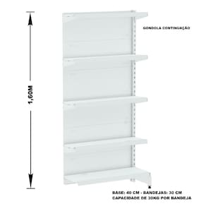 A Gôndola Parede Continuação 160 é recomendada para quem tem a gôndola inicial e pretende aumentar projeto, daí o nome continuação. Indicada para supermercados, mercearias, lojas de utilidades e outros.