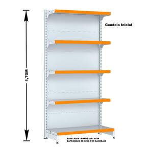 GONDOLA PAREDE 170 FIT AMAPÁ PARA VÃO DE ATÉ 2 METROS MAIS UM CANTO 40/30 BRANCO 15 BANDEJAS PORTA ETIQUETA LARANJA