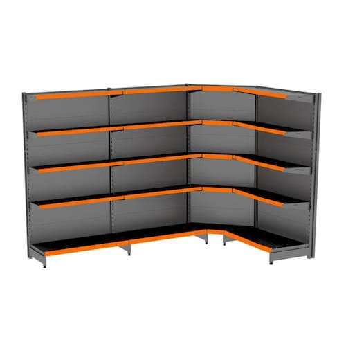 GONDOLA PAREDE 170 FIT AMAPÁ PARA VÃO DE ATÉ 3 METROS MAIS UM CANTO 40/30 PRETO 20 BANDEJAS PORTA ETIQUETA LARANJA