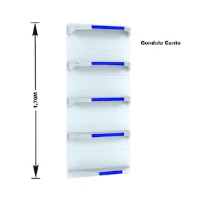 GONDOLA PAREDE 170 FIT AMAPÁ PARA VÃO DE ATÉ 4 METROS MAIS UM CANTO 40/30 BRANCO 25 BANDEJAS PORTA ETIQUETA AZUL
