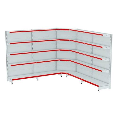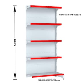 GONDOLA PAREDE 170 FIT AMAPÁ PARA VÃO DE ATÉ 4 METROS MAIS UM CANTO 40/30 BRANCO 25 BANDEJAS PORTA ETIQUETA VERMELHO