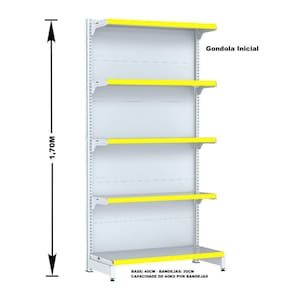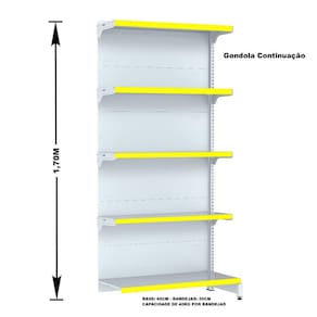 GONDOLA PAREDE 170 FIT AMAPÁ PARA VÃO DE ATÉ 5 METROS MAIS UM CANTO 40/30 BRANCO 30 BANDEJAS PORTA ETIQUETA AMARELO