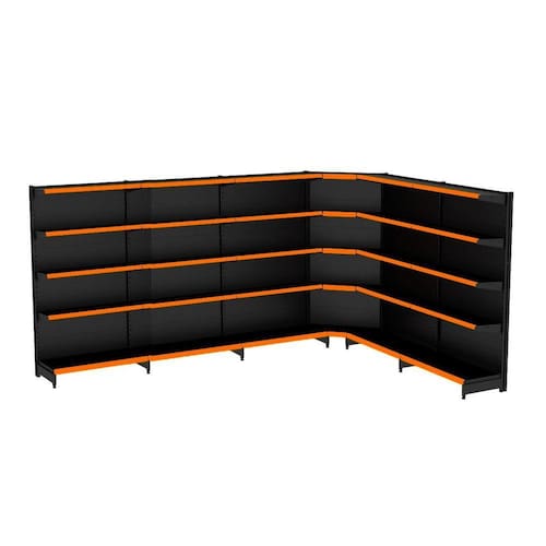 GONDOLA PAREDE 170 FIT AMAPÁ PARA VÃO DE ATÉ 5 METROS MAIS UM CANTO 40/30 PRETO 30 BANDEJAS PORTA ETIQUETA LARANJA